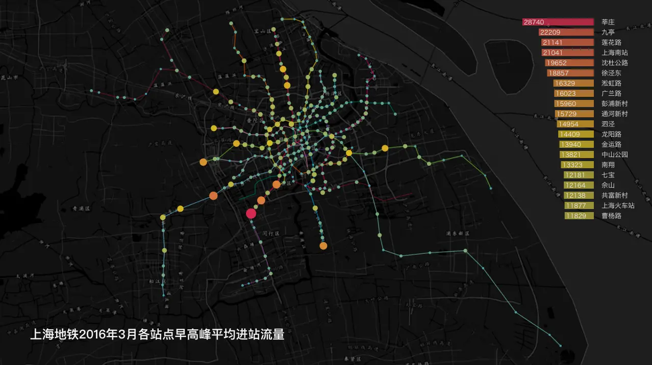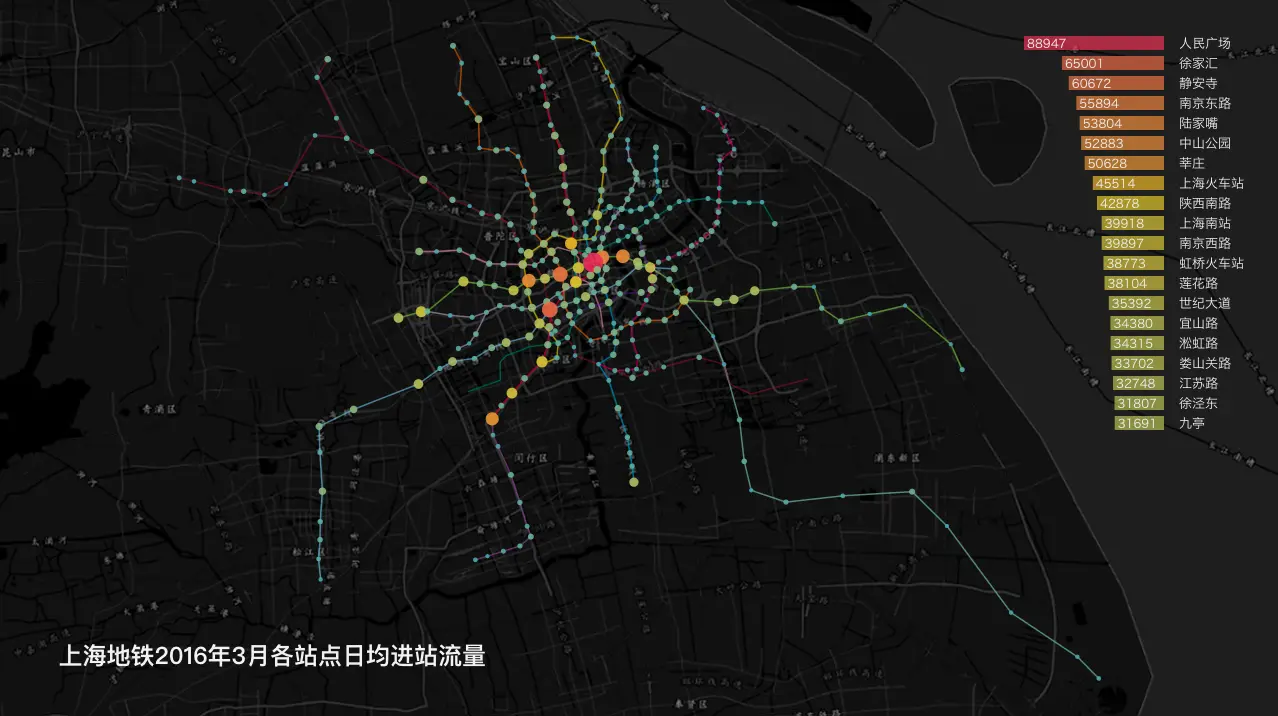 不信,来看看每天各个站点的进站客流(数据来自于SODA提供的2016年3月地铁数据)。天未亮,人已行。早高峰期间,进站客流以莘庄、九亭等站点居多,人潮从四面八方汹涌而来,只为赶往市区按时上班。晚高峰期间,人民广场、徐家汇等站点进站客流暴涨,忙碌一天,各回各家,这就是每个普通人的生活。