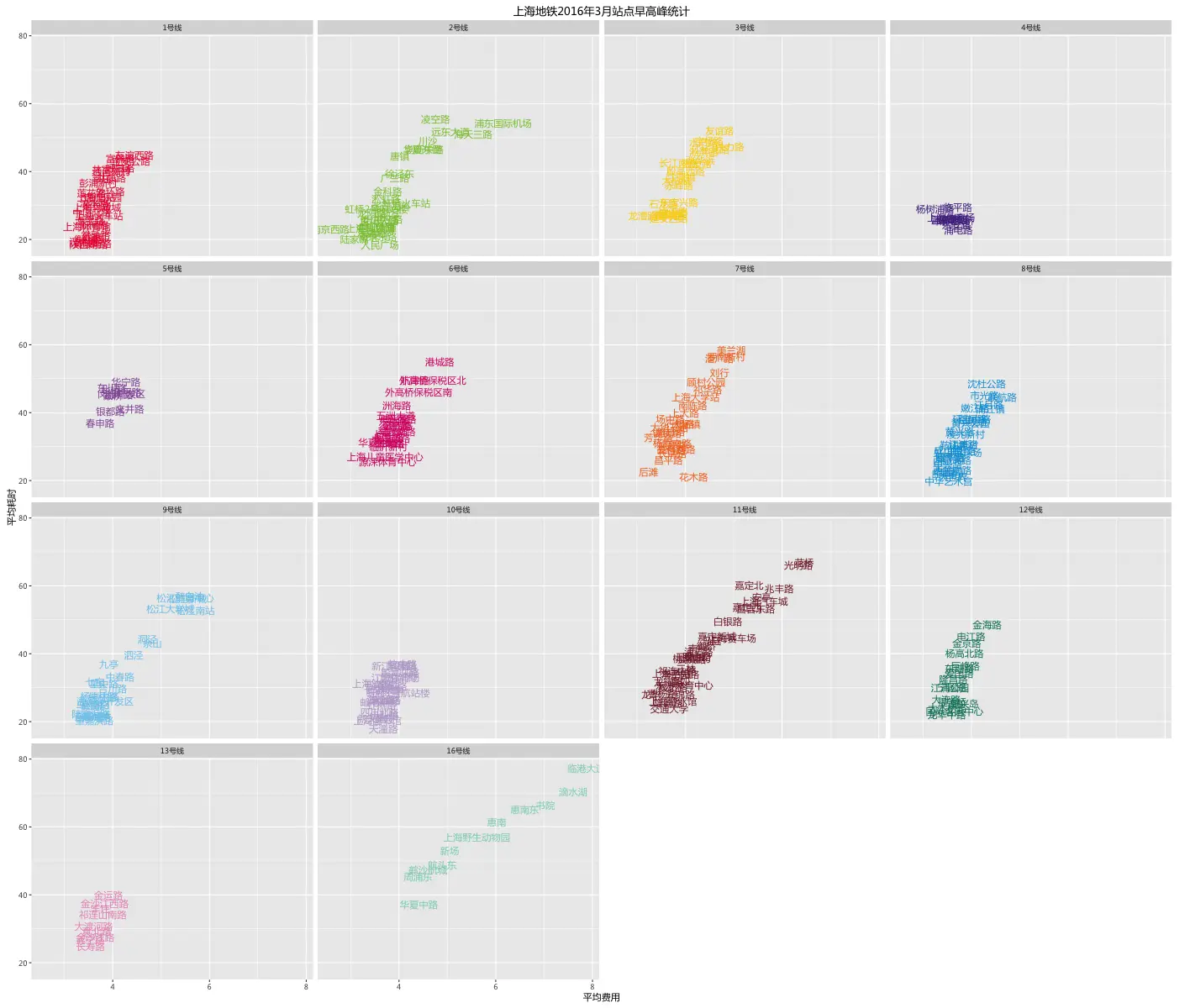 用散点图能看得更清晰一些。横轴表示进站客流,纵轴表示出站客流,颜色表示所属线路。所以右下角的站点多为居住区,左上角的站点多为工作区。