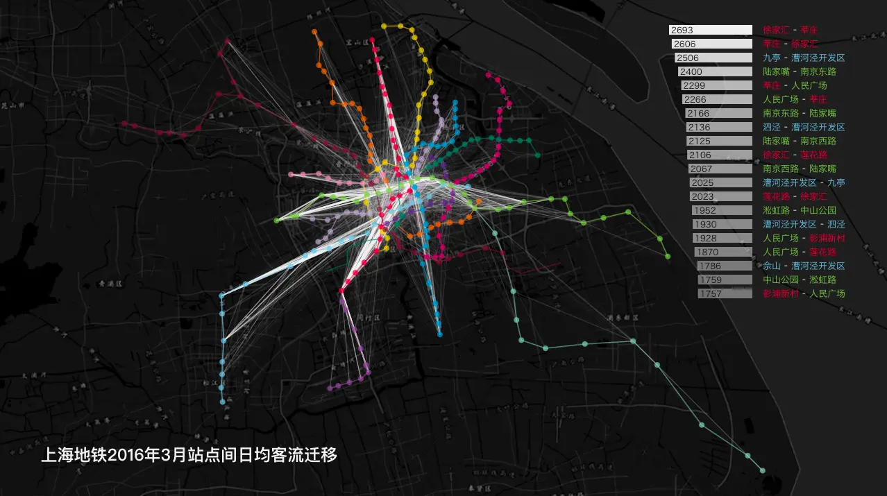 再来看看站点之间的客流迁移,在众多地铁线路中,1号线、2号线担任极其重要的角色,屹立于客流迁移网络交汇之处的,是人民广场、徐家汇、静安寺等核心站点。