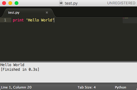 print 'Hello World'保存完毕后,按Ctrl+B运行代码,即可看到打印出来的Hello World。