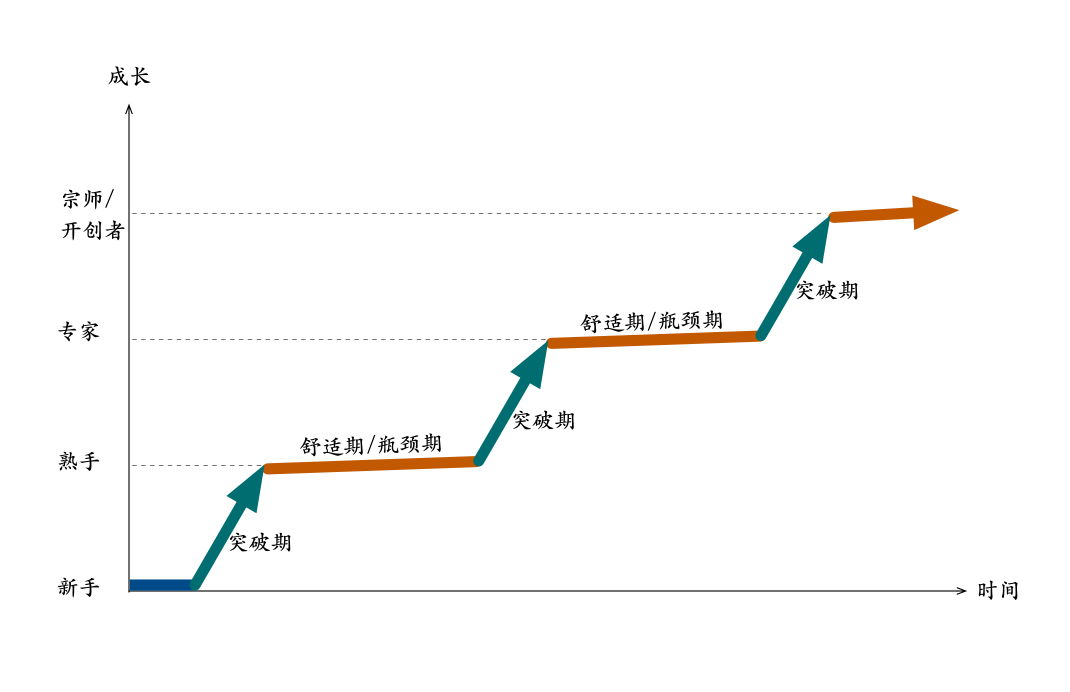 一般来说,突破的过程,绝非轻而易举,而且有可能伴随着阵痛。它需要我们付出十分的心力,甚至承担一定的风险,做成一些原本超出自己能力极限的事情。而一旦过了突破期,各种技能在这个层次上融会贯通,就会给我们带来极大的自信和成就感。这个时候,处理同一层面的问题,逐渐变得轻车熟路,于是进入了舒适期。