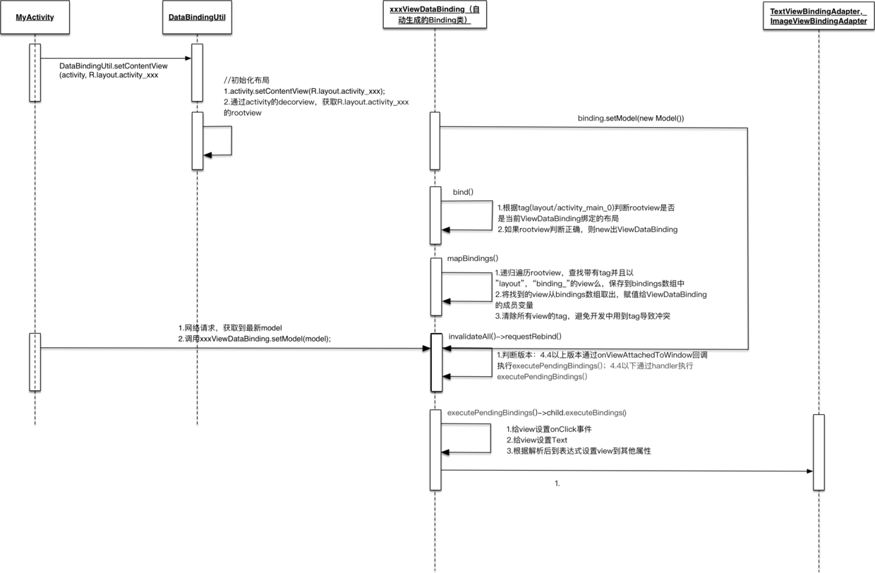 以上便是当我们通过DataBindingUtil.setContentView()对Databinding进行初始化,以及当我们获取到最新数据,通过Binding.setModel进行数据更新时的操作流程。