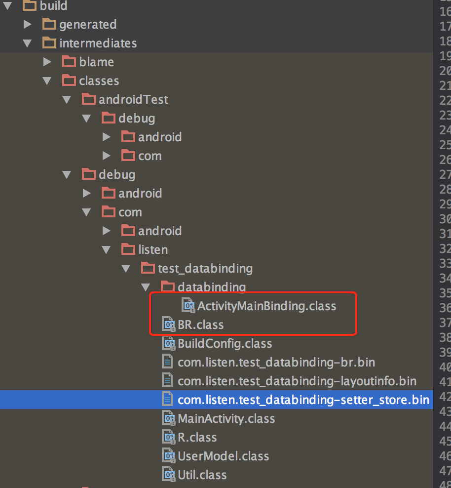 根据解析后的activity_main-layout.xml,和layout下的activity_main.xml文件,生成build/intermediates/classes/debug/[项目路径]/databinding/
