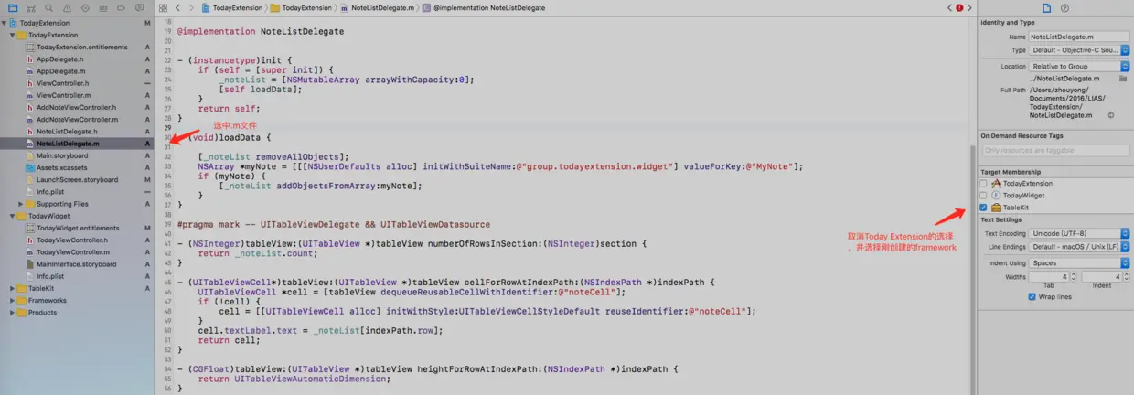 在这个简单的记事App中,并没有十分复杂的自定义cell,为了解释如何共享代码,我将App中列表的datasource和扩展中列表的datasource抽出来成为一个NoteListDelegate类,因为扩展和App都是同一份数据,所以我只要在这个NoteListDelegate类中实现一次tableview的datasource代理方法,然后生成一个framework,在App和扩展中引入就可以同时使用了。