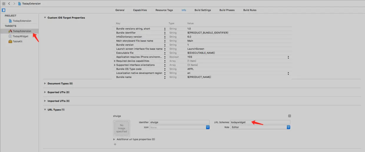 通过别的App打开我们自己的App,我们需要先设置URL Types,如下图,添加一个新的URL Type,然后设置URL Schemes,命名为todaywidget,通过这个Schemes,就可以在别的App中调用下面方法: