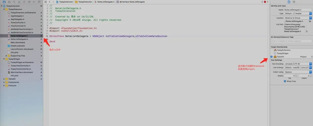 选中.m文件,右侧Target Membership先取消TodayExtension的Target,然后选中我们所创建的framwork,如下图