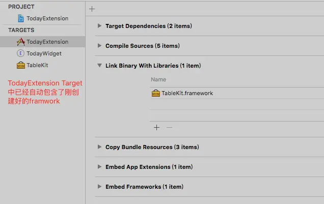 在我们这个App中,记事列表的cell相对比较简单,但是如果我们需要使用更复杂的cell,而一般在通知中心扩展中,我们的UI有很大部分是跟App相同的,但是我们的扩展和App并不在一个Target当中,这也就代表着同样的代码,在扩展和App中我们需要分开两份,这样显然是很不合理的一种方式。所以,很多时候,我们需要在扩展和App之间共享代码,也就是将所有公用的文件添加到一个framework中,这样我们只要在扩展中引入这个framework,就可以使用其中的代码了。