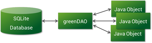 弄明白greenDao之前我们应该先了解什么是ORM(Object Relation Mapping 即 对象关系映射),说白了就是将面向对象编程语言里的对象与数据库关联起来的一种技术,而greenDao就是实现这种技术之一,所以说greenDao其实就是一种将java object 与SQLite Database关联起来的桥梁,它们之间的关系 如下图所示;