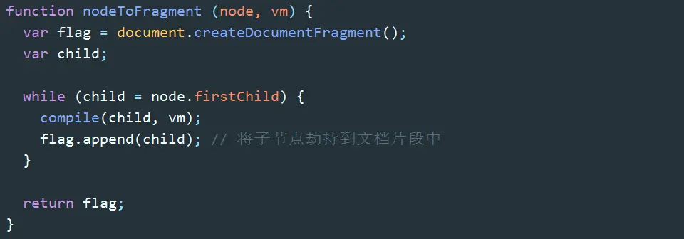 DocumentFragment(文档片段)可以看作节点容器,它可以包含多个子节点,当我们将它插入到DOM中时,只有它的子节点会插入目标节点,所以把它看作一组节点的容器。使用DocumentFragment处理节点,速度和性能远远优于直接操作DOM。Vue进行编译时,就是将挂载目标的所有子节点劫持(真的是劫持)到DocumentFragment中,经过一番处理后,再将DocumentFragment整体返回插入挂载目标。
