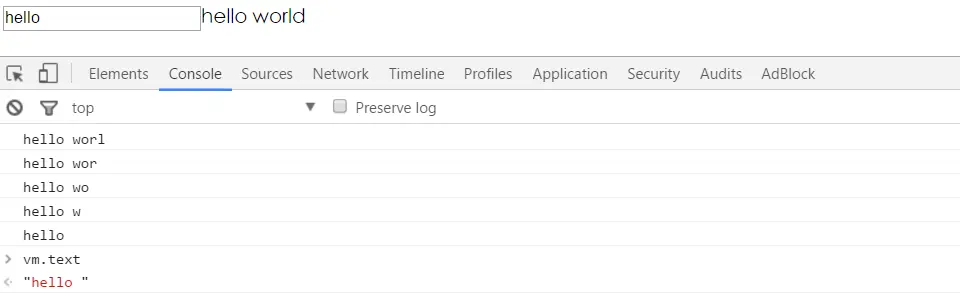 至此,hello world双向绑定就基本实现了。文本内容会随输入框内容同步变化,在控制器中修改vm.text的值,会同步反映到文本内容中。