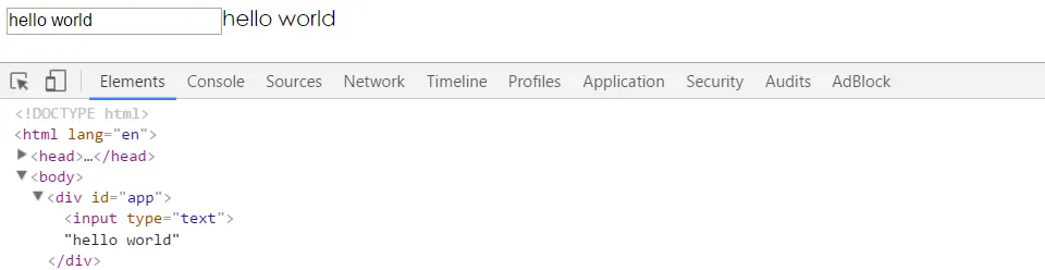 以上代码实现了任务一,我们可以看到,hello world已经呈现在输入框和文本节点中。