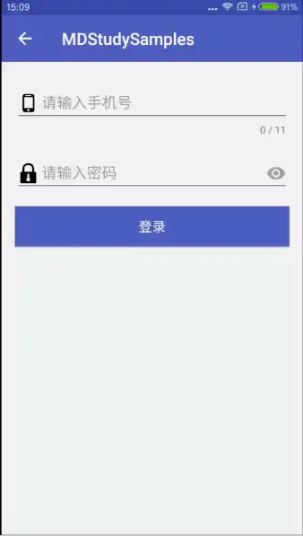 使用时,只需要将 TextInputLayout 中的 EditText 替换成 TextInputEditText 控件即可,属性和 EditText 一样,没有什么其他特殊用法,我们看一下效果图。