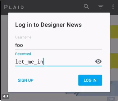 TextInputLayout时,设置 EditText 的 drawable 图标时需要同时使用相对值 (start/end) 和 绝对值 (left/right),否则 drawable 存在显示兼容问题。控制密码显示状态的切换按钮的图标默认呈黑色眼睛状,TextInputLayout 提供了一些属性供开发人员自由设置其颜色与形状。比如「Nick Butcher」大神在他的项目 plaid 中利用 path 给图标做出了一个很炫酷的切换动画效果,再加上文字和小黑点的切换效果,简直完美,如下图所示 (图片源自 Twitter):