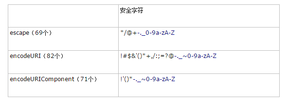 下面的表格列出了这三个函数的安全字符(即函数不会对这些字符进行编码)