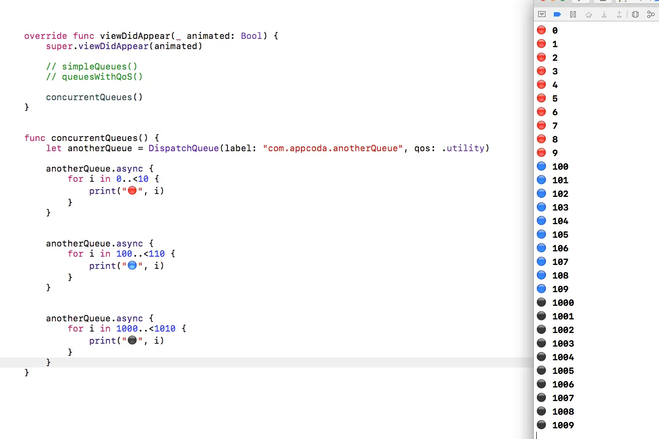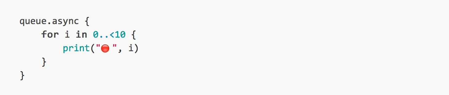 注意,这里我们使用了相同的 QoS class,所以这两个队列拥有相同的运行优先级。就像我们之前所做的一样,第一个队列会执行一个循环并打印出 0 ~ 9(加上前面的红点)。第二个队列会执行另一个打印出 100 ~ 109 的循环(使用蓝点)。