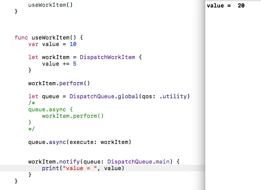 现在让我们通过一个小例子来看看 DispatchWorkItem 如何使用。前往 useWorkItem() 方法,并添加如下代码: