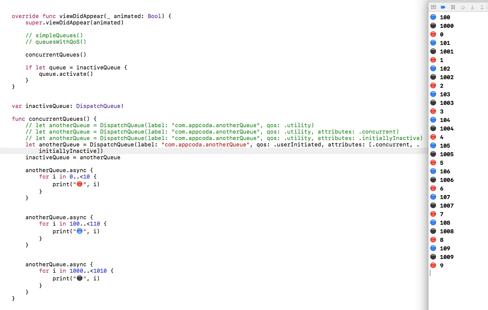let anotherQueue = DispatchQueue(label: "com.appcoda.anotherQueue", qos: .userInitiated, attributes: [.concurrent, .initiallyInactive])