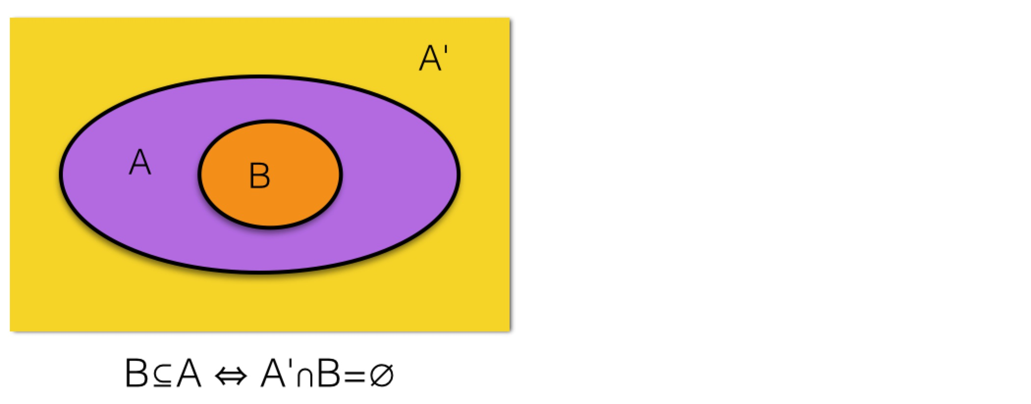 最后的位操作有点晦涩。我们从集合论的角度解释下,containsAll就是在检查参数c表示的集合是不是当前集合的子集。一般而言,集合B是集合A的子集,即B⊆A,等价于A'∩B是空集∅,A'表示A的补集,如下图所示: