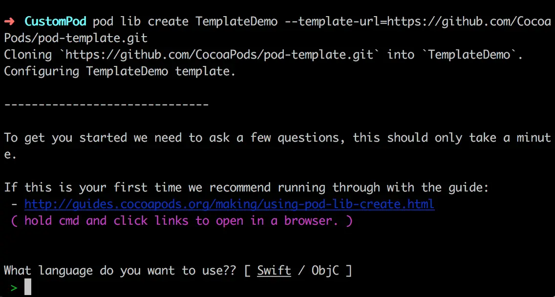 当执行pod lib create ProjectName时,其实是下载了一个pod模板,然后在内部通过更改.podspec文件的配置定制化自己的pod,pod lib create ProjectName其实使用了默认参数,补全的话pod lib create ProjectName --template-url=https://github.com/CocoaPods/pod-template.git,