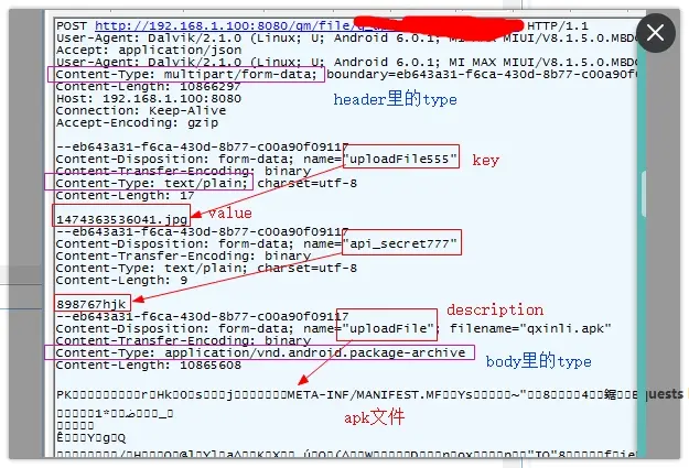 Call<ResponseBody> call = serviceUpload.uploadWithProgress(configInfo.url,paramsMap,requestBodyMap);抓包可以看到其传输的形式如下: