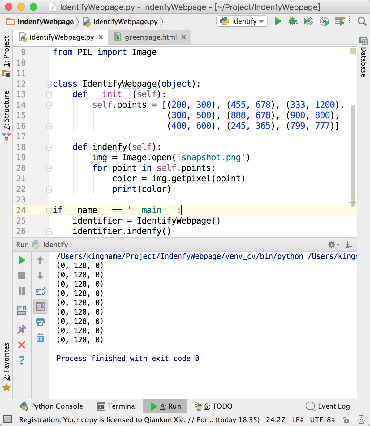 程序使用Image模块载入截图,并从截图中读取某一点颜色RGB值: