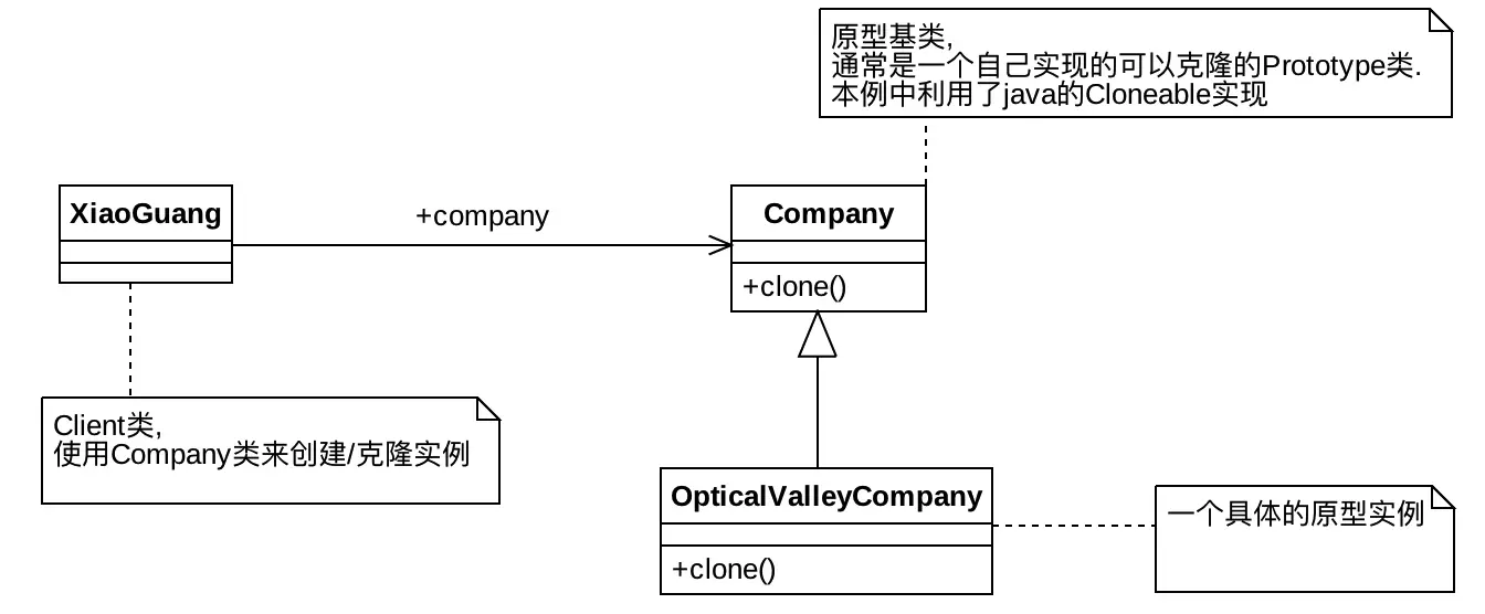 我们在故事中多次提到了clone, 原型. 没错, 这个就是原型模式. 照例, 我们来梳理下类之间的关系, 相对简单: