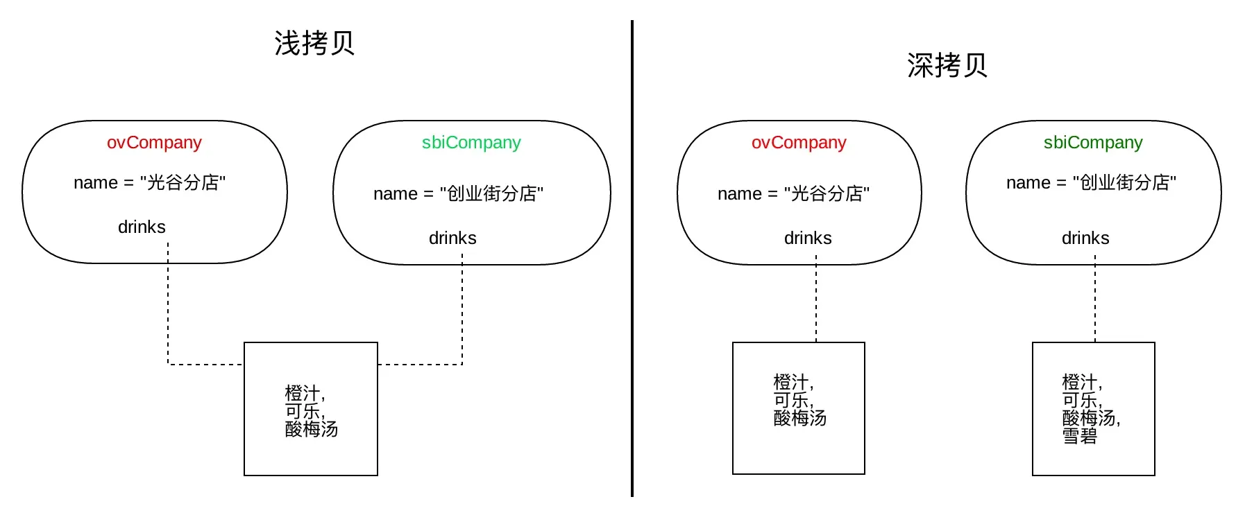 }我们注意到, 这个clone只是clone了Company, 并没有clone Company内部的引用(ArrayList drinks). 也就是说clone出来的对象和之前的对象会使用同一份drinks列表注1, 这显然不是小光愿意看到的.
