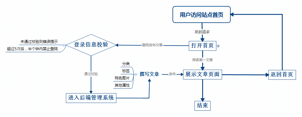 其实在上面的系统中,我已经把前端用户的文章查阅功能排除掉的。为什么我这里会单独排掉前端的查阅呢?前端的文章查阅功能基本在后端的所有文章中已经有体现相应功能。大概功能如下: