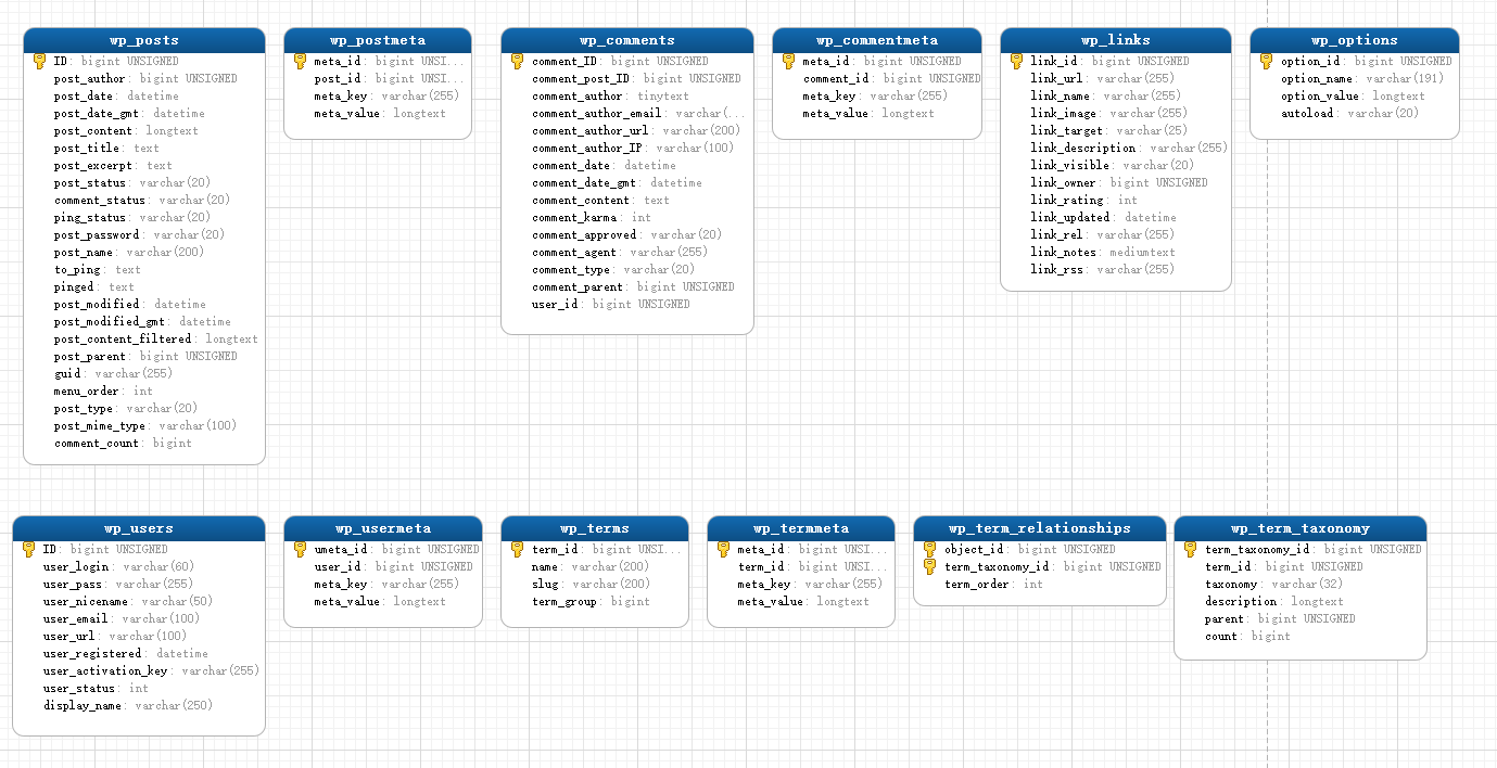 从上面的数据库模型中我们可以看出维持wordpress中心的有几张表,如下: