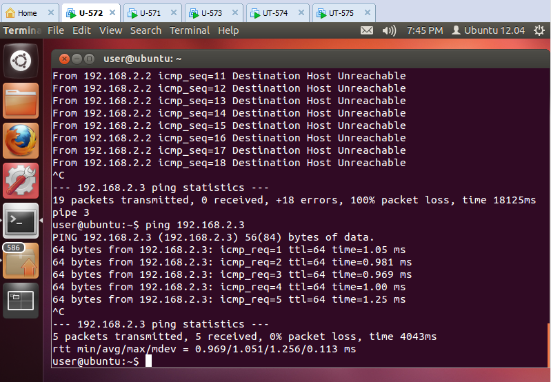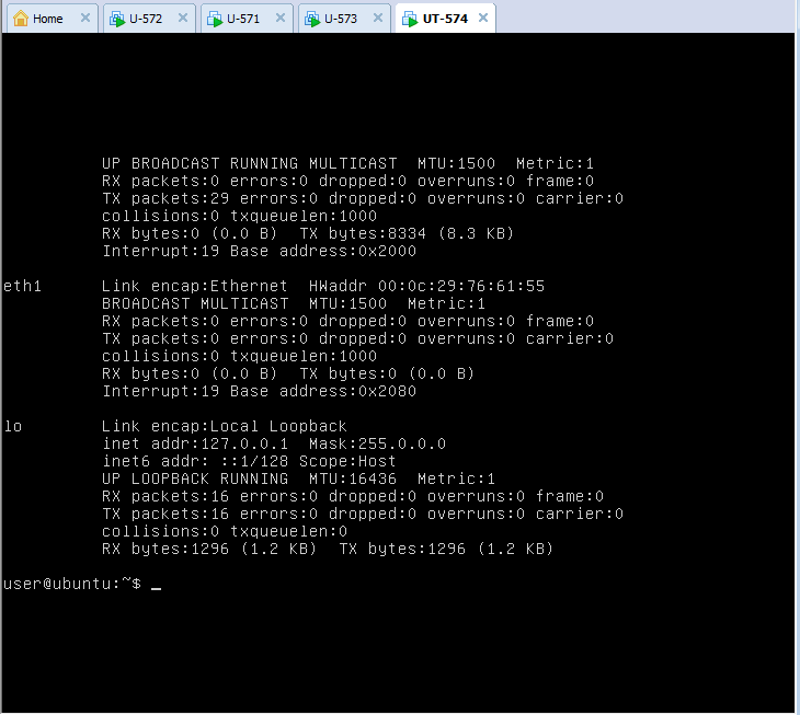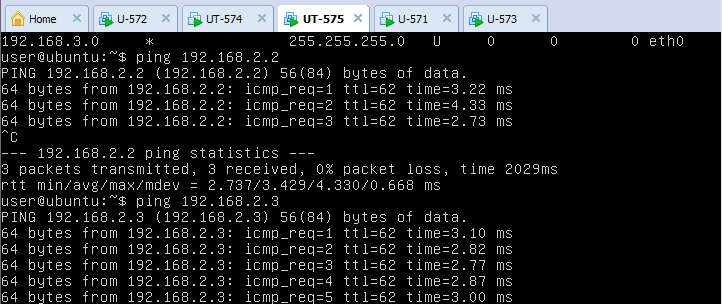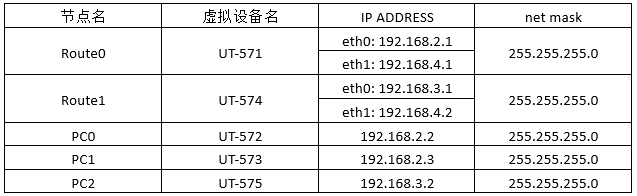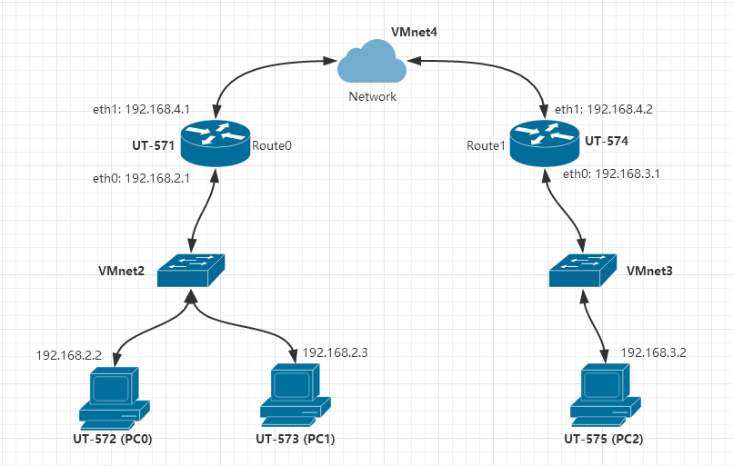 此次实验我们采用5台虚拟机,分别为UT-571~UT-575,网络拓扑中有两台路由器,分别用UT-571和UT-574来模拟,两个路由器通过网络相连,这里用虚拟网络VMnet4来模拟,两个路由器分别下辖PC0,PC1和PC2三台主机,三台主机分别用UT-572,UT-573和UT-575来模拟。