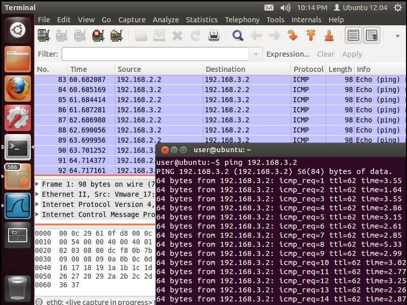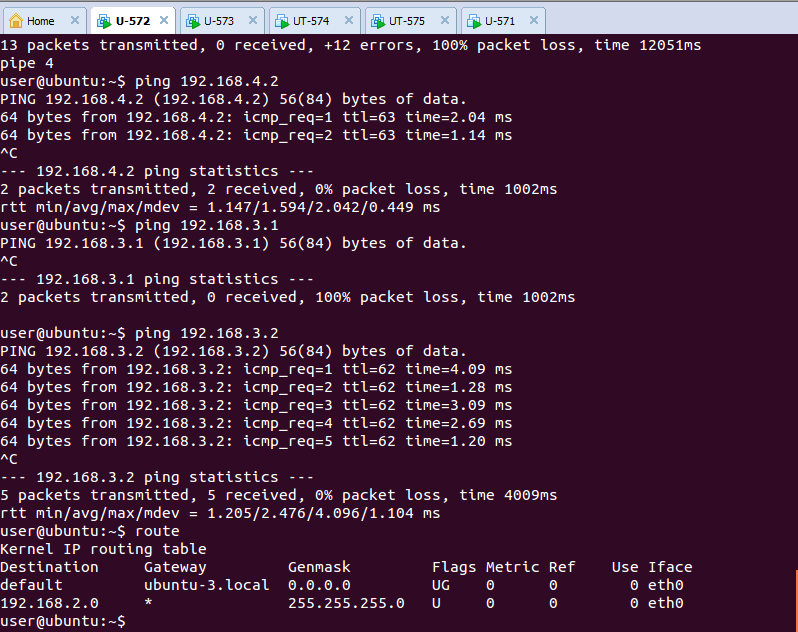 其中 ip route add 192.168.2.0/24 via 192.168.2.1 命令添加的规则,告诉路由目的 ip 在192.168.2.0/24(192.168.2.1~192.168.2.255)网段内的封包经由 ip 地址为 192.168.2.1 的设备(Route0)转发出去,即下一跳的 ip 为 192.168.2.1。而 192.168.2.0/24 是 Linux 中常用的掩码表示方式。24 表示掩码字长为 24 即掩码为 255.255.255.0, 192.168.2 为网络号, 1 ~ 254 为网络中的主机号。此外还有其他形式用于添加路由规则的命令。而第二条规则表示告诉路由目的IP在192.168.3.0/24网段的封包要经过的下一跳IP为192.168.4.2(即VMnet4的另一端,也即Route1的eth1,因为Route1是网段192.168.3.0/24的路由器)