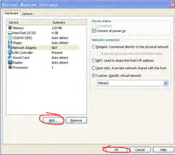 添加网卡的配置,选择Custom: Specific virtual network,将机器配置到对应的虚拟网络,如PC0和PC1配置到VMnet2,PC2配置到VMnet3,两个路由器虚拟机配置添加两块网卡分别设为两个网段。