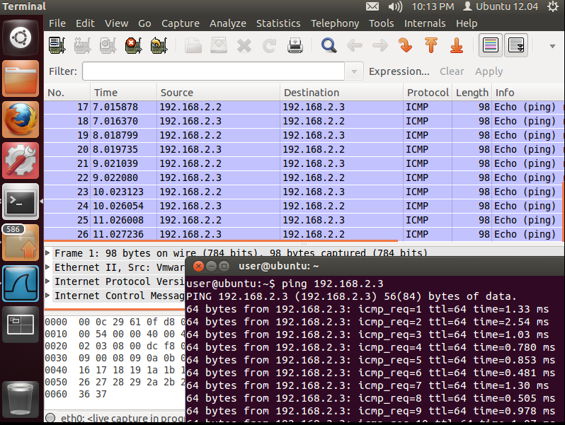 启动wireshark,通过下图蓝框选择要监听的设备,如eth0,然后在终端中启动ping,观测数据包的来往: