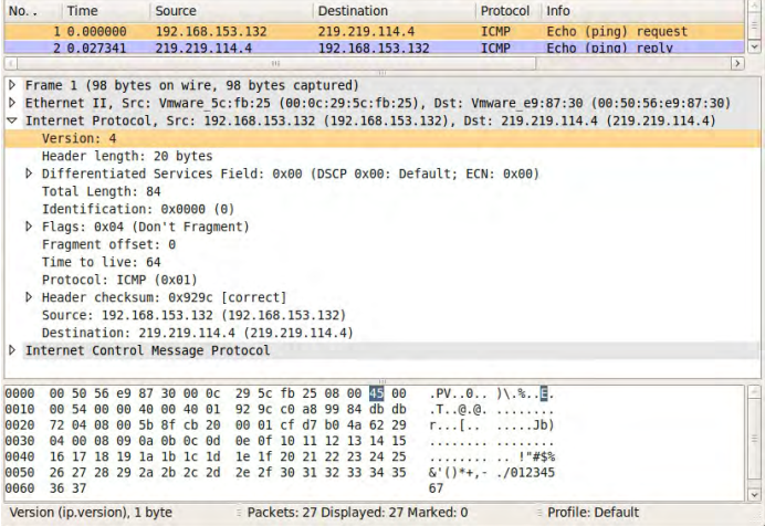 协议框中显示所选分组的各层协议:物理层帧、以太网帧及其首部、 IP 协议数据报及其首部, Internet控制报文协议。原始框中则显示分组中包含的数据的每个字节。从中可以观察到原始数据,其中左边显示的是十六进制的数据,右边则是 ASCII 码。在协议框中选中一个条目,在原始框中会标记出对应的原始数据,反之在原始框中选中也一样。