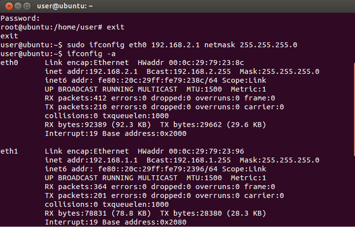 sudo ifconfig eth0 192.168.2.1 netmask 255.255.255.0 # 设置eth0端IP地址