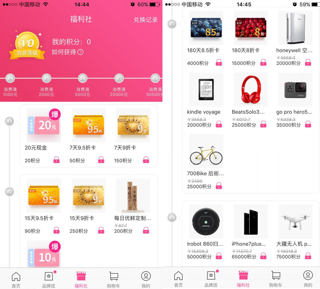 再比如,生鲜电商APP每日优鲜的“福利社”活动,不同等级的会员享受不同的积分兑换福利,等级越高,积分可兑换的可选物品越多,价值也越大。一级的会员只能用积分换20元现金和7天的打折卡,而最高级会员可以用积分兑换到iphone7、无人机、迪拜游等高价值物品。等级的划分是以消费金额为标准,而积分也是通过消费行为获得。