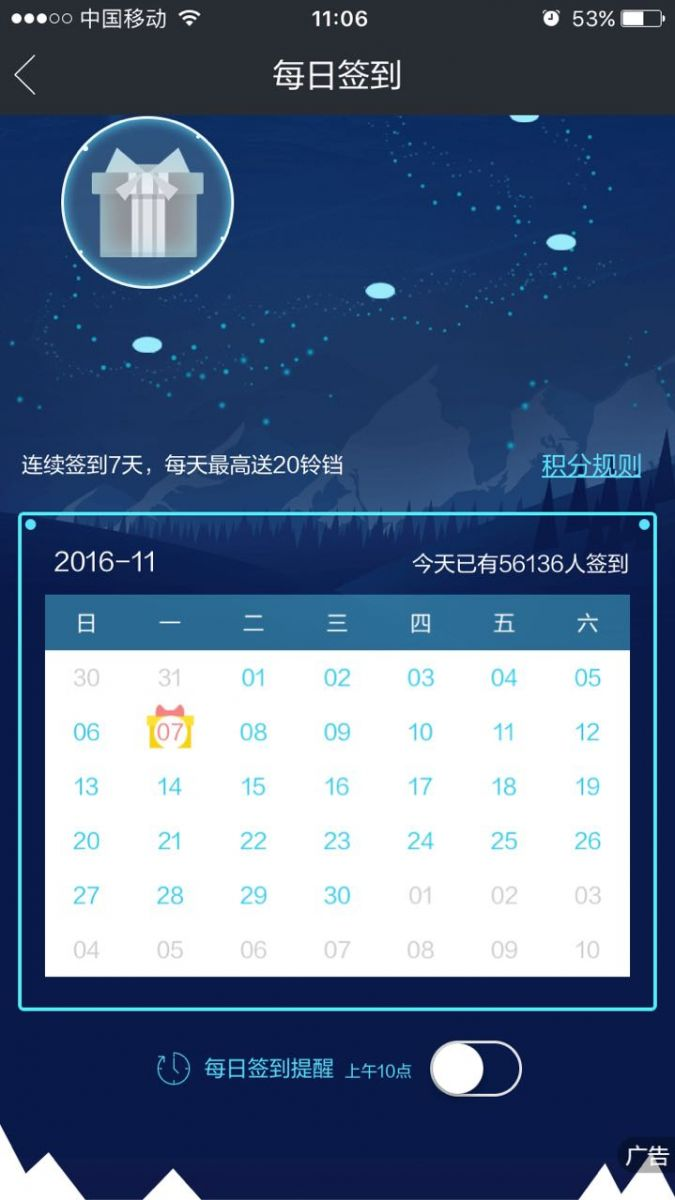 签到的操作简单,每天签到每天有奖,物质的刺激能充分调动用户的积极性,最终培养成每天登录签到的习惯,日活跃因此形成。另外,用户来签到,肯定是打开并登录了APP,也会顺便看看APP其他信息,这样更深层次的活跃度就被提升上来了。