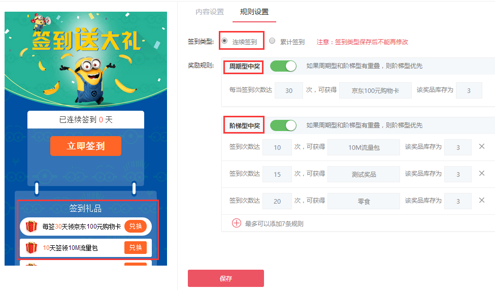 活动盒子这款活动运营工具就提供了签到的模板,支持连续性签到和累积性签到的设置;同样支持周期型和阶梯型的奖品的设置。类似活动盒子这样的第三方工具的使用,对大多数APP商家来说,只需简单的上传奖品和规则设置操作,会更加省时省力。