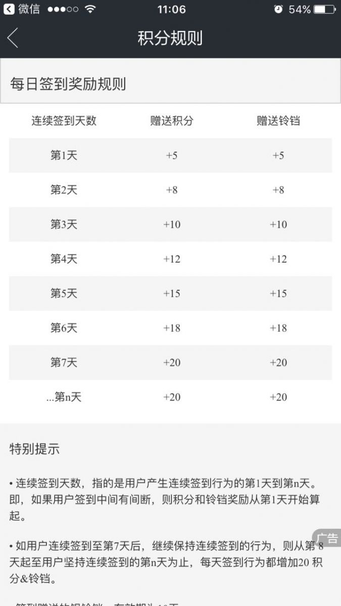 签到前7天,每天可以获得不同的积分和铃铛,积分和铃铛随签到天数不断增加,属于阶梯型奖品设置;从第8天开始,每连续签到1天,都可以重复获得20积分和20 铃铛,奖品不再变化,属于周期型奖品设置。假如某一天断签了,再次签到时,奖品将从第1天的5个铃铛/积分算起,大打折扣。