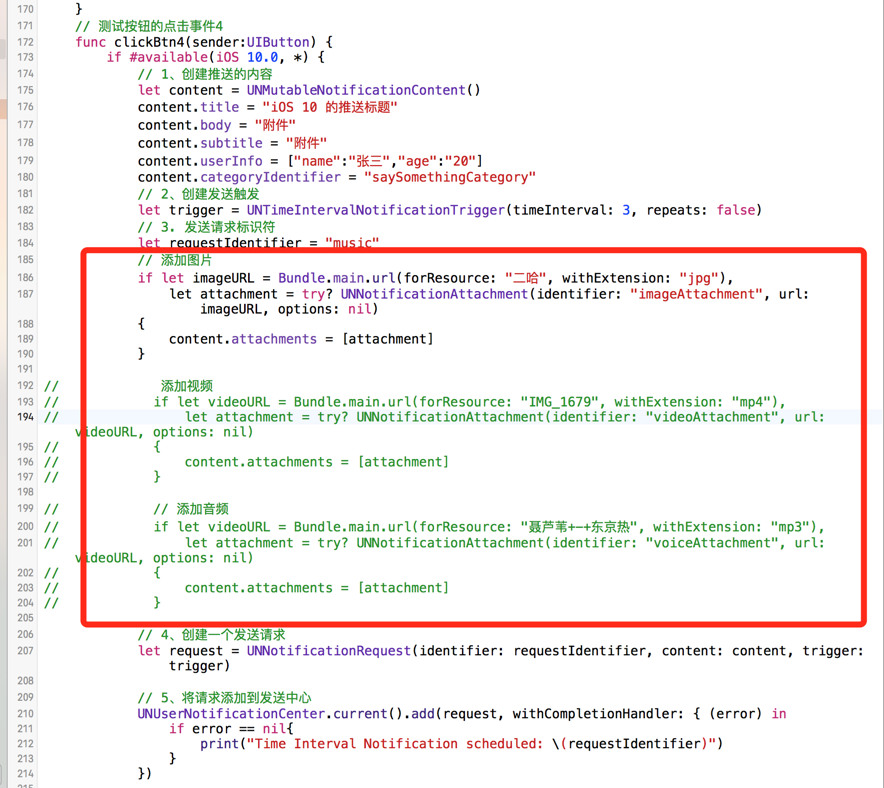 }} notification.alertBody = Optional("body") notification.userInfo = Optional([AnyHashable("age"): 20, AnyHashable("name"): 张三])