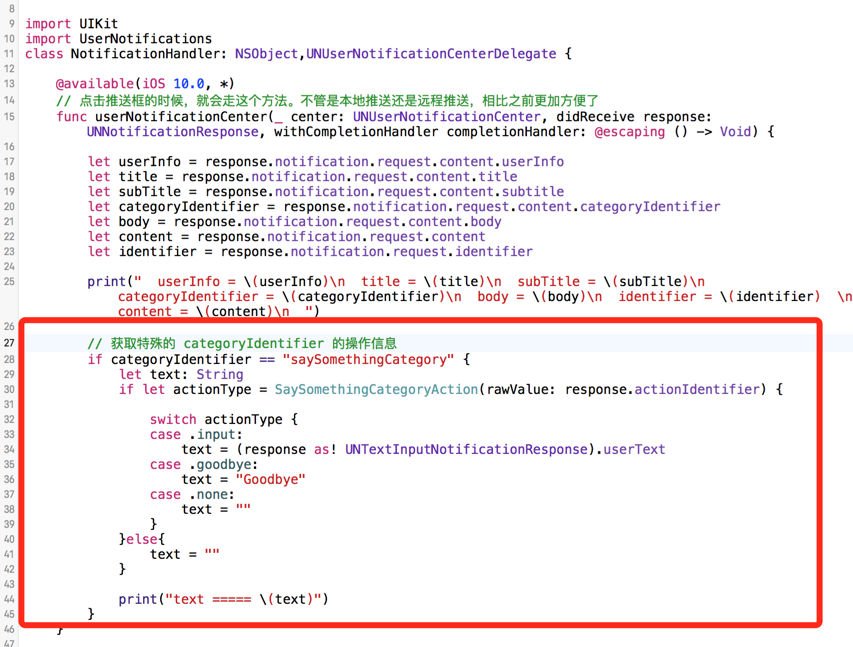 以上代码可以理解为提前注册一个特殊标识的UNNotificationCategory