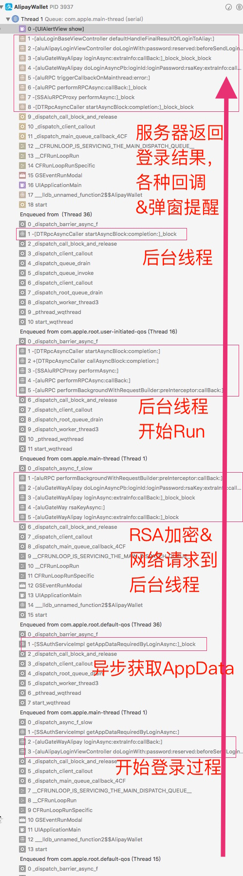 可以看到,OC函数这部分的符号已经恢复了,函数调用栈里已经能看出大致的调用过程了,但是支付宝里,采用了block的回调形式,所以还有很大一部分的符号没能正确显示。