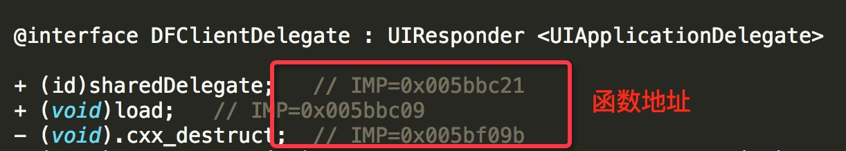 因为OC语言的特性,编译器会将类名、函数名等编译进最后的可执行文件中,所以我们可以根据Mach-O文件的结构逆向还原出工程里的所有类,这也就是大名鼎鼎的逆向工具 class-dump 了。class-dump 出来的头文件里是有函数地址的: