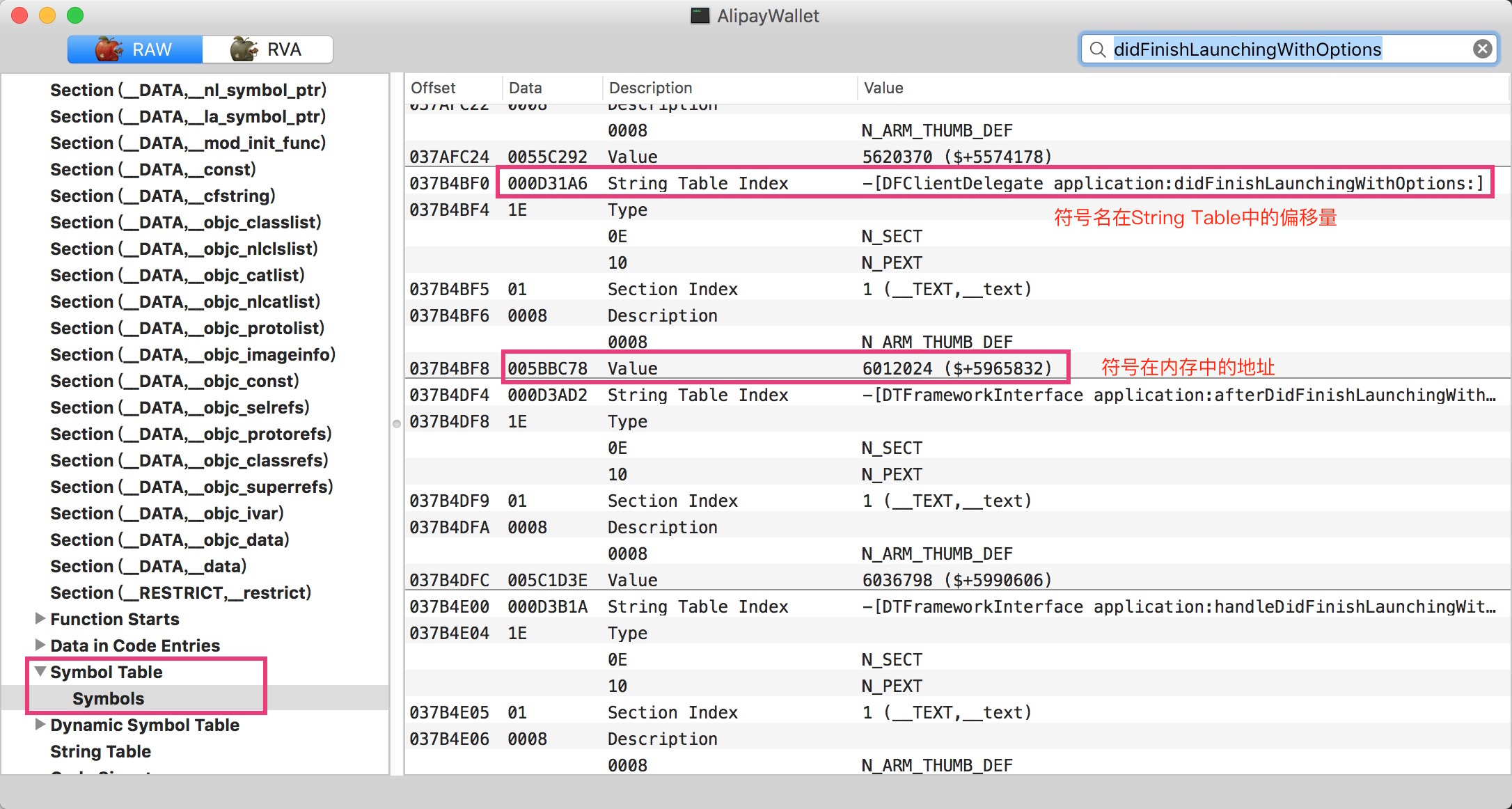 这里我们用 MachOView 打开支付宝的可执行文件,找到其中的 Symbol Table 项。