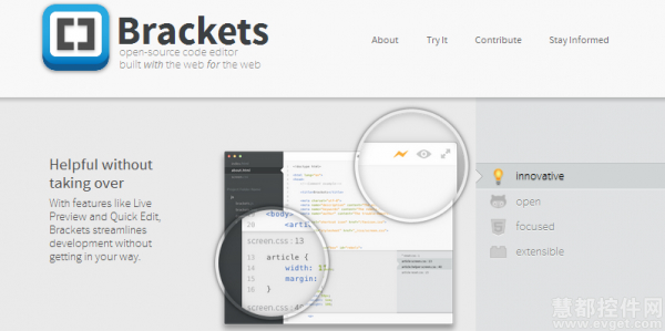 Brackets 是开源的代码编辑器,前端工程师和Web设计人员比较适用,支持多平台,且不需要区分前后端。界面非常整洁,清新。启动非常快。项目之间切换也非常方便。