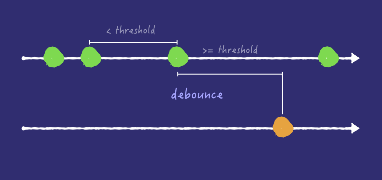 我们可以看到,不管上游事件触发了多少次,下游就产生了一次事件。也就是说当一次事件发生后,事件处理器要等一定阈值的时间,如果这段时间过去后 再也没有 事件发生,就处理最后一次发生的事件。假设还差 0.01 秒就到达指定时间,这时又来了一个事件,那么之前的等待作废,需要重新再等待指定时间。