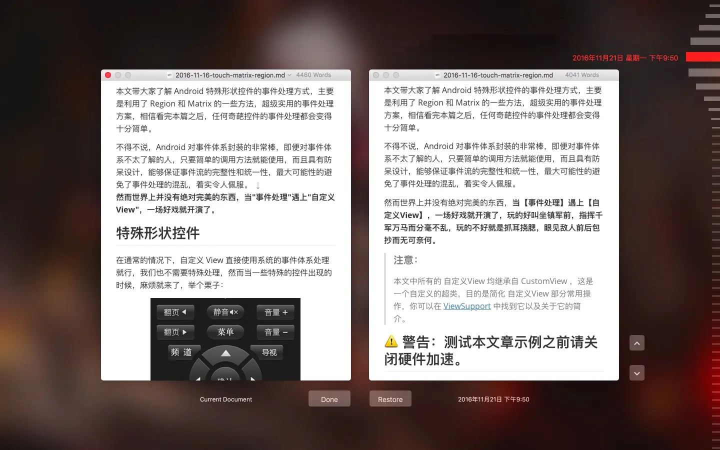 Trpora 也用到了这一特性,点击 File > Revert To > Browse All Versions 就能看到了。以我之前发布的一篇文章为例: