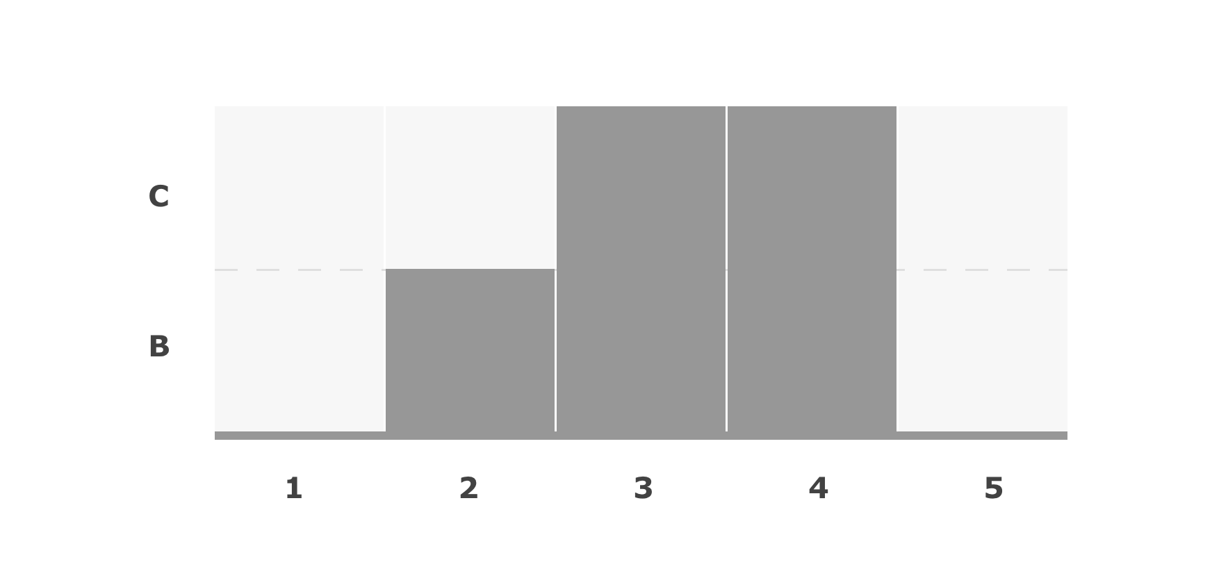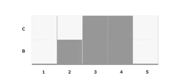 以 A1-D5 为矩阵边界,我们从 D 列开始开始对每一列计算直方图的最大矩阵,其中图中的“upper”为直方图的上部方向。对于每一列,我们使用一个长度为 N (如果使用 Sentinel 来避免边界计算的话则为 N+1)的 cache 数组来存储当前列的直方图高度,即其右侧连续公共属性矩阵的长度。拿 B 列举例,其对应的直方图为: