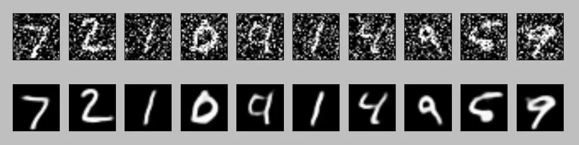 先看一下最后的结果,使用的是手写数字MNIST数据集,上面一行是添加噪音的图像,下面一行是去噪之后的结果。