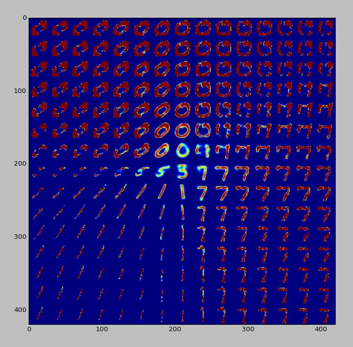 如果将隐层中的点解码到原始的图像表示空间,则各个聚类中心会出现对应的数字,而类和类之间的位置则会出现“新的数字”,即不同数字之间的过渡形态。